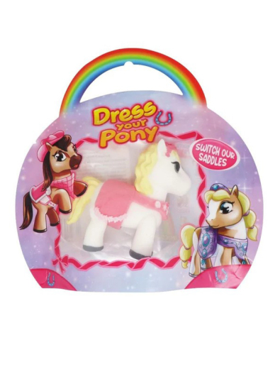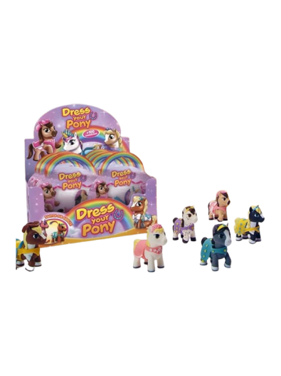 Da li ste spremni za super ponije sa različitom odećom? Promenite kostime i otkrijte svoj omiljeni stil! 12 različitih ponija jedva čeka da vas upozna! A tu su i 2 posebna ponija sa rogovima…stvaranje novih stilova je u vašim rukama zahvaljujući njihovoj fleksibilnoj strukturi i odeći koja se može skinuti! Kesica sadrži jednu figuricu ponija i kostima. Kolekciju čini 12 različitih ponija: Honey, Jasmine, Dolly, Dreamy, Sweetie, Candy, Stella, Luna, Brittany, Baby, Angel i Crystal. Veličina pakovanja: 19x4x16 cm.
